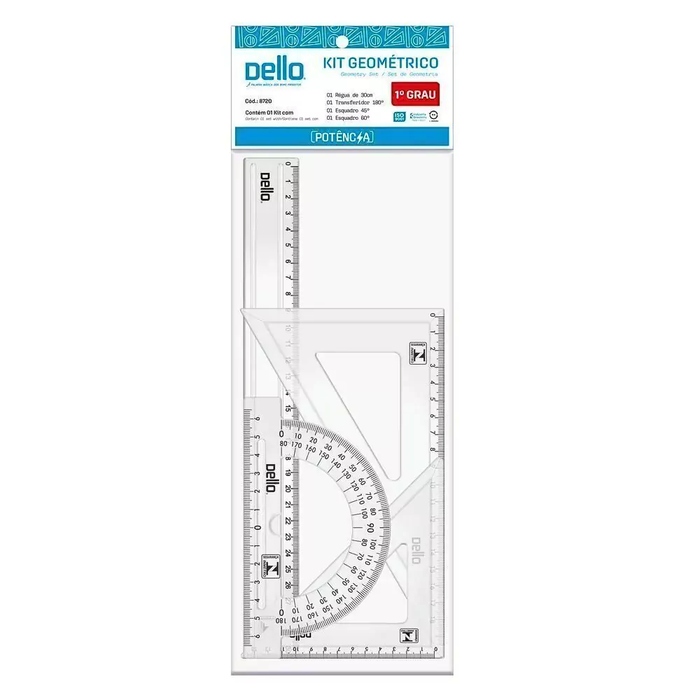 - Conjunto para desenho composto por 1 régua 30cm, 1 transferidor 180º, 1 esquadro 30º X 60º (16cm) e um esquadro 45º (16cm).